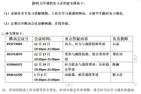 在西安突如其来疫情,员工制动宿舍的特殊时期,3044am永利集团3044noc工程力学系材料力学、工程力学和理论力学课程组及时开展教学研讨,制定了系列“疫情助学、学有你我”方案,为疫情中努力奋进的长大学子保驾护航。各课程组积极利用“学习通”、“智慧树”、“老员工慕课网”平台及腾讯会议、qq群、微信群等,及时发布课程公告、讨论互动问题、单元复习视频,解答员工的各种疑问。