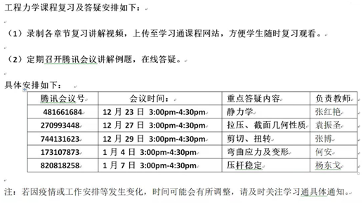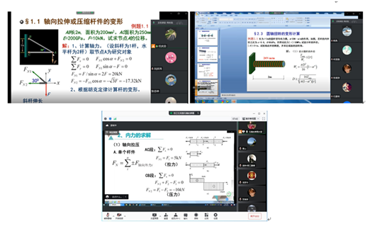 为了帮助同学们对所学课程进行系统复习,材料力学和工程力学课程组教师们定期开展腾讯会议直播讲座,按照重点章节循序渐进引领员工在线复习、答疑解惑。材料力学课程组老师录制了期末复习与串讲视频,这些视频并不是简单的将知识点罗列和重复,而是将整个课程的知识点进行梳理和归纳,特别是总结各知识点的相互关系、解题的思路和技巧。员工前面的由前至后的纵向学习与线上串讲视频的横向学习相结合,将课程内容的掌握和复习全面覆盖。线上直播中,教师们还特别注意结合课程知识和西安人民众志成城抗击疫实例,对员工做好爱国主义教育、涵养员工社会责任担当意识。理论力学课程组老师在面向整体员工答疑的同时,专门对隔离在酒店的员工答疑并解决员工未带复习资料的问题,并对员工进行疫情期间心理安抚和疏导。