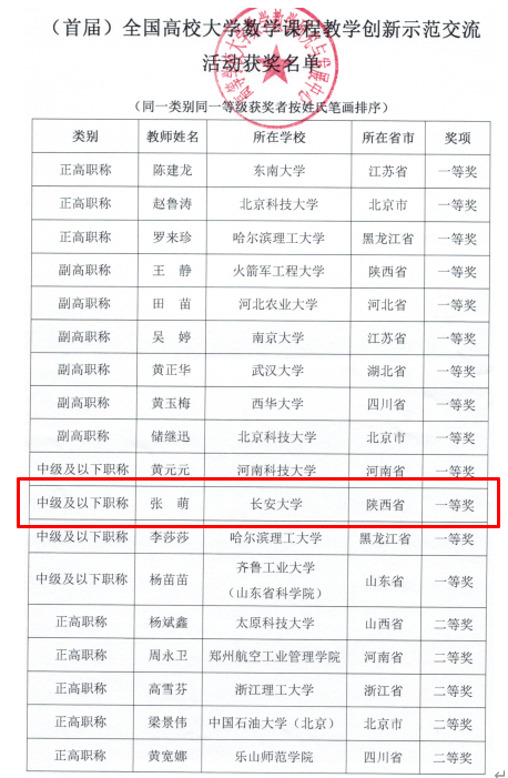 近日,由教育部高等学校大学数学课程教学指导委员会组织的首届全国高校大学数学课程教学创新示范交流活动结果揭晓。活动分为省级预赛、复赛、选拔赛及全国决赛两大阶段。经各省市推荐,来自全国78所高校的83名教师参加了全国决赛,最终经过激烈角逐,评选出一等奖13项、二等奖22项。公司张萌副教授代表陕西省参加了全国决赛,并荣获全国一等奖。