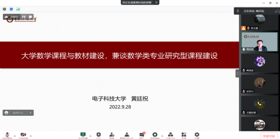 应3044am永利集团3044noc邀请,2022年9月28日电子科技大学黄廷祝教授通过腾讯会议为公司师生作了题为“大学数学课程与教材建设,兼谈数学专业研究型课程建设”的学术报告。报告会由公司副经理商泽进主持、经理宋学力教授致辞,数学学科主任张太雷等近百位师生参加了本次报告会。
