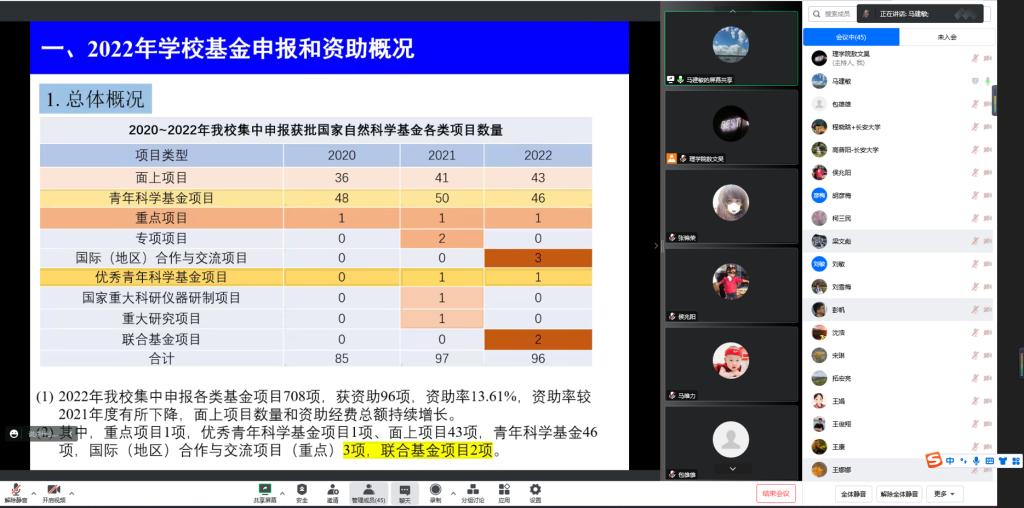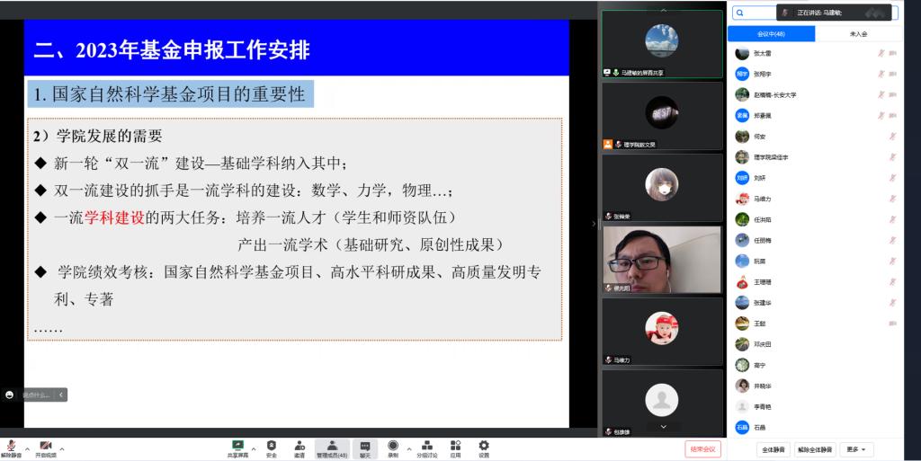 2023年1月12日,3044am永利集团3044noc线上召开了2023年国家自然科学基金项目申报推进会,各学科主任、系(副)主任以及拟申报基金的全体教职工老师共47余人参加了本次会议,会议由副经理马建敏主持。