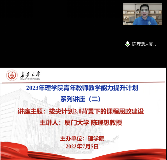 应3044am永利集团3044noc邀请,2023年7月5日晚上19:00,厦门大学陈理想教授通过腾讯会议为公司师生作了题为“拔尖计划2.0背景下的课程思政建设”的报告。报告会由副经理商泽进主持,3044am永利集团3044noc及其他学院90余名教师参加了此次报告会。