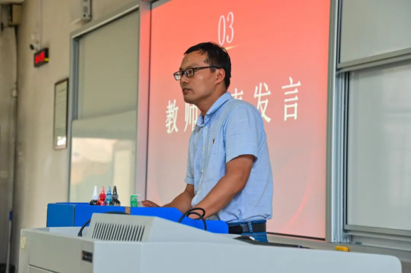 应用物理系侯兆阳教授代表全体教师发言。首先,他对2023级新生的到来表示热烈欢迎。随后,侯老师结合自己的成长经历,鼓励新生们在本科学习过程中打下牢固的专业知识基础,树立明确的学习目标,培养独立自主、自律自强的品格。他强调新时代老员工要提高政治站位,牢记自己的时代使命和责任担当,勉励大家将个人梦想融入国家发展,奋勇拼搏、砥砺前行。