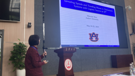 首场报告由兰州大学李万同教授主持,美国奥本大学的沈文仙教授做了题为“Spreading Speeds and Traveling Waves in Chemotaxis Systems with Logistic Source on R^N”的报告,加拿大纽芬兰纪念大学的赵晓强教授分享了题为“Propagation Dynamics of Reaction and Diffusion Equations in a Time-heterogeneous Shifting Environment”的精彩报告。