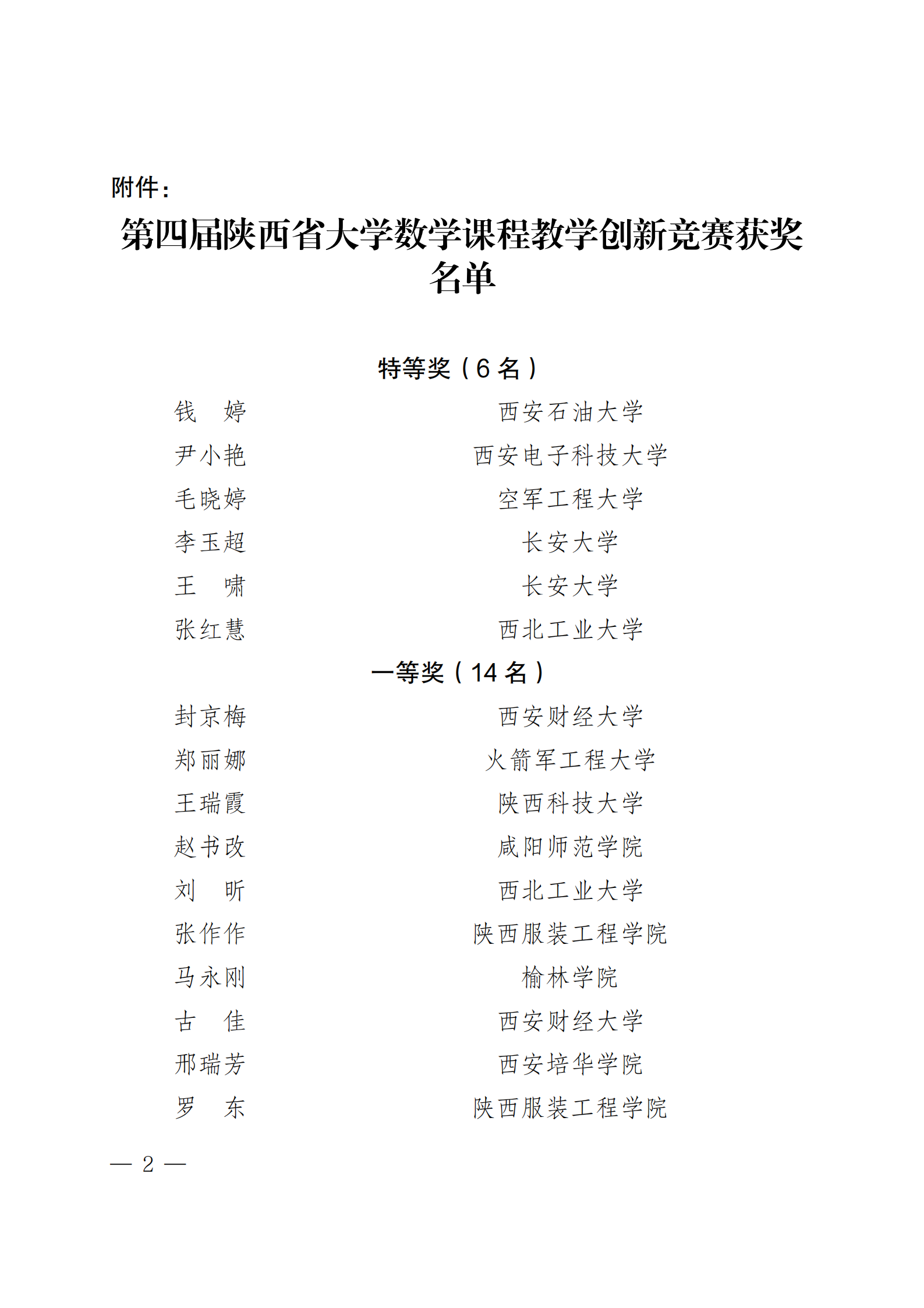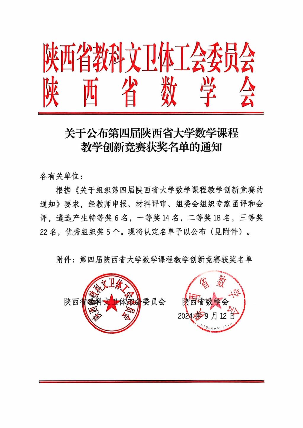 在近日公布的第四届陕西省大学数学课程教学创新竞赛结果中,公司两位青年教师李玉超、王啸均获特等奖,是参赛高校中唯一一所参赛教师均获特等奖的高校,为学校和学院争取了荣誉。
