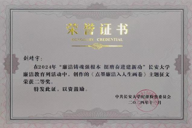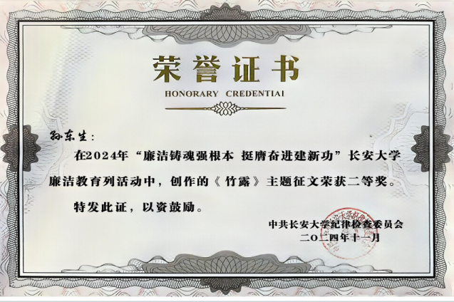 传承优良传统,抒写廉洁风尚。3044am永利集团3044noc倡导广大师生结合工作、学习、生活实际,撰写诗歌、散文、随笔、信件等,记录和展现新时代廉洁新风尚,以廉洁浩然正气温润学风家风。参与第九届高校廉洁教育系列活动作品征集,申报高校廉洁教育课堂实践案例:“扎实学、亲眼看、切身悟、化成型”沉浸式廉洁教育。学院研究生、本科生多人在2024年“廉洁铸魂强根本,挺膺奋进建新功”永利集团廉洁教育活动征文中获得奖项。