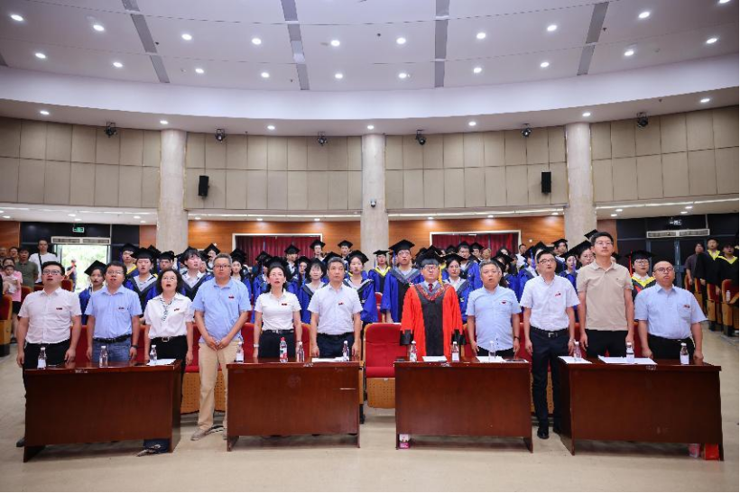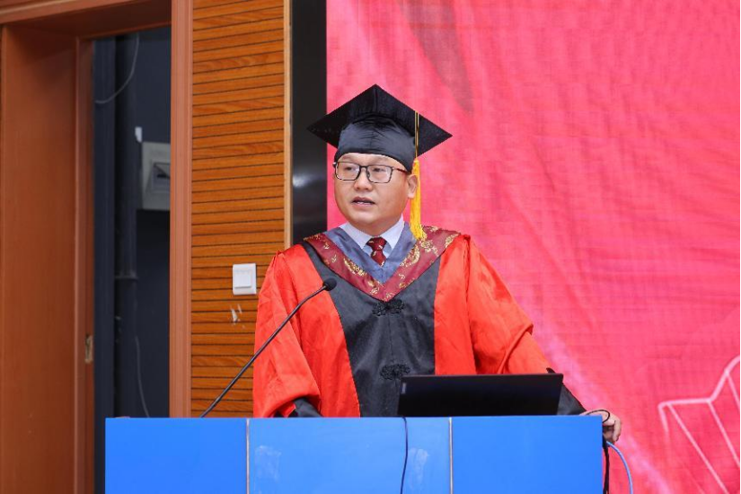 在雄壮的国歌声中,毕业典礼正式开始。学院学位评定分委员会主席、经理宋学力教授致辞,向全体毕业生致以最热烈的祝贺和最美好的祝福,向所有帮助毕业生成长成才的老师、家长及朋友致以最衷心的感谢。他充分肯定了2025届员工在思想、学习、生活等方面的成长,与同学们分享了近年来学院在人才培养、团队建设和科研平台建设等方面取得的成绩。并提出三点希望与大家共勉:一是坚定理想信念,以专业技能和综合素养实现人生价值;二是心怀感恩和敬畏之心,在生活和工作中勇于担当;三是树立持续学习理念,争取在社会大学中做一个优秀的员工。最后他祝福同学们健康快乐,成就更好的自己。