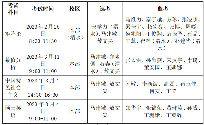 所有巡、监考老师务必于考前30分钟到达指定领题地点现场查看监考考场安排(校本部北院主楼三楼研究生院321室(阅卷室)处签到并领取试卷,监考考场安排会在领取试卷时公布);同一考场的监考老师同时到考务组领取试题及监考牌。