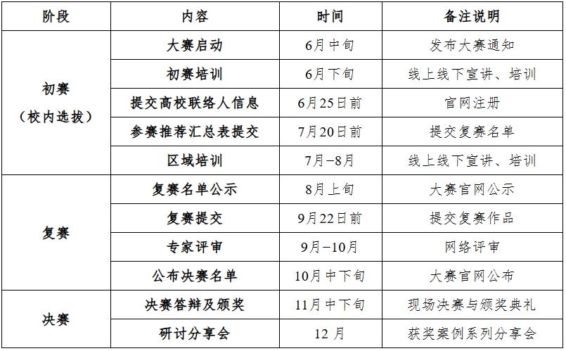 大赛设本科赛道和高职赛道,分为校内初赛、全国复赛、全国决赛三个阶段。复赛分学科专业门类评审,根据课程内容,设置“文、理、工、医、农、术”等组别。决赛评审不分学科专业门类。