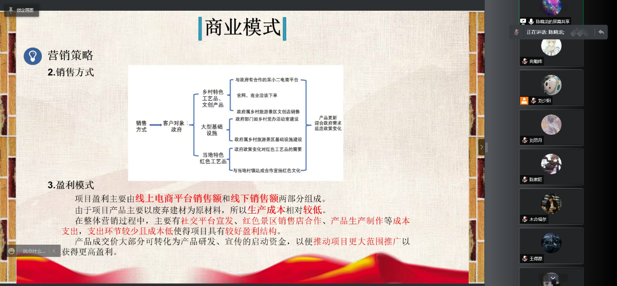 本次活动分为项目展示和评委提问两个环节。活动伊始,主持人程子轩致开幕词并宣读比赛规则。九支队伍依次进行PPT讲解和问题答辩。同学们先介绍了作品的创作灵感,再通过相关学术研究体现作品的创新性、可行性,并展望项目的发展前景,凸显作品的市场优势。每组结束讲解后,评委向各个团队进行提问,指出不足,并结合项目的创新性、合理性、科学性、未来展望等方面进行打分。