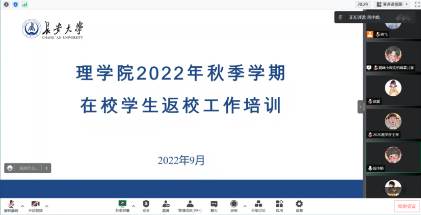 为确保2022年秋季学期员工返校工作有序开展,切实维护师生健康安全,根据上级部门及属地有关要求,结合学院工作实际,2022年9月7日至8日,3044am永利集团3044noc各年级通过腾讯会议,分别召开2022年秋季学期员工返校培训会议,公司党委副书记屈颖,辅导员刘延海、杨雪菲、周小娟,全体本科生、研究生以及部分员工家长参加了会议。
