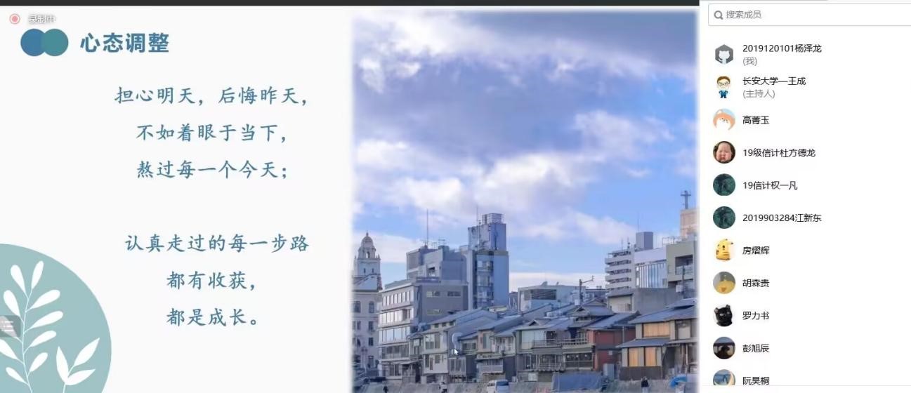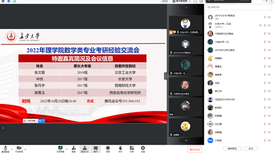 为助力员工考研、解答考研疑惑、增强考研信心。10月28日,3044am永利集团3044noc2019级数学类专业通过腾讯会议举办了考研经验交流会,会议邀请到公司2021届和2022届优秀员工,现为北京工业大学、永利集团、西南财经大学和西安应用光学研究所研究生的张文霞、申悦、张丹宇和高菁玉同学为同学们举办了考研经验交流会。会议由思政班主任王成主持,近50位同学参加了本次交流会。