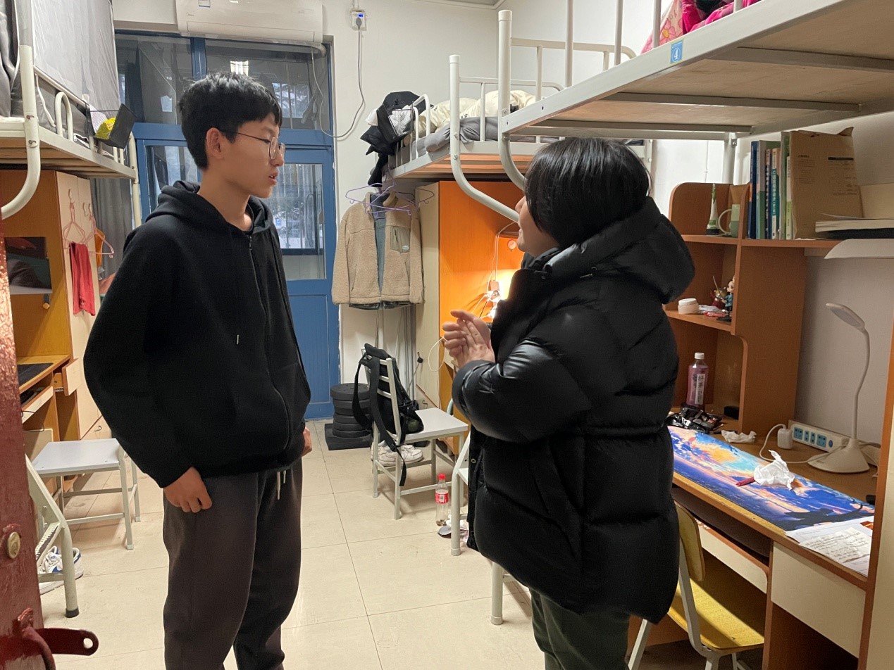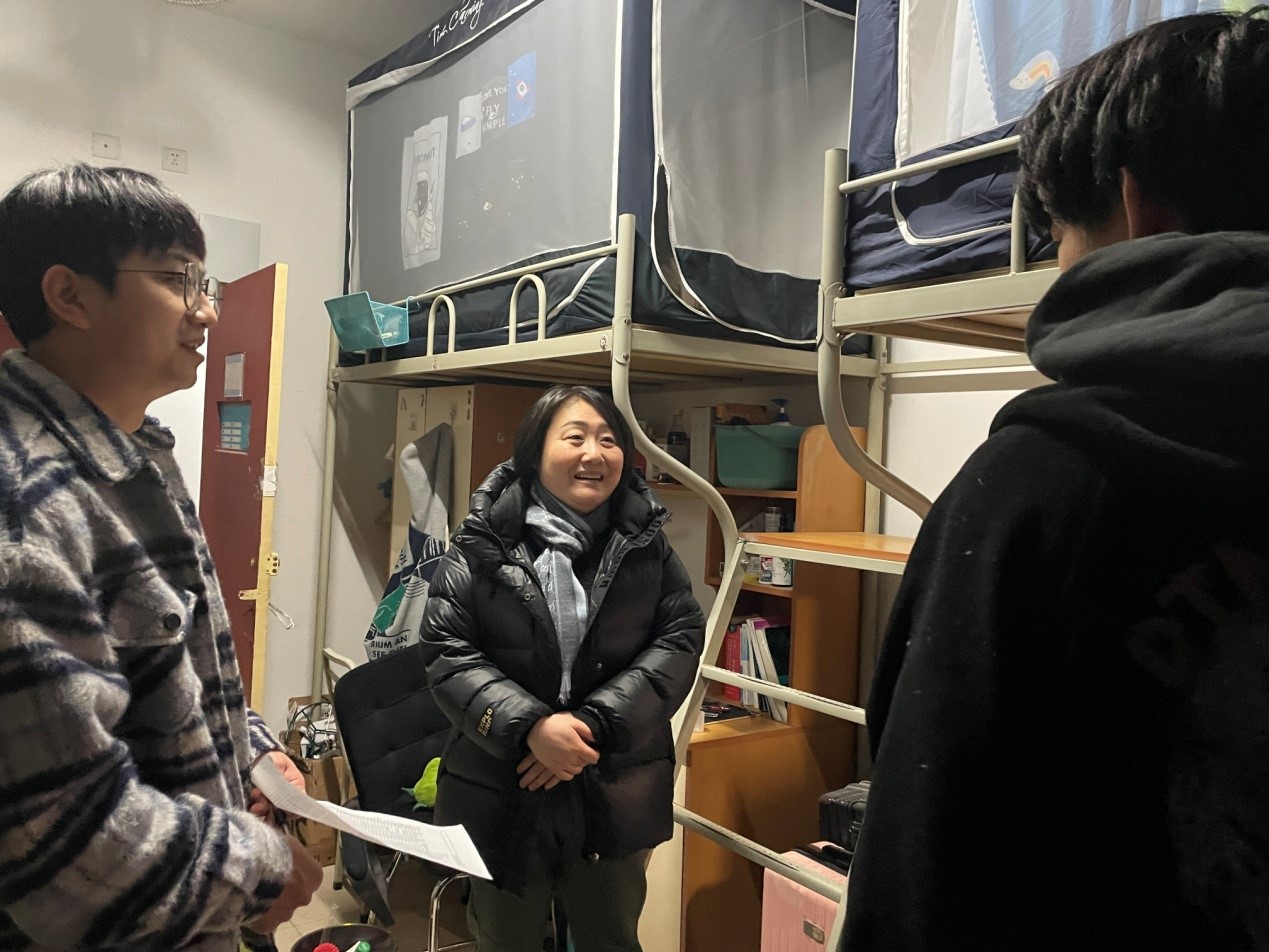 在走访过程中,院领导与员工进行了亲切交流,询问同学们在本学期的学习生活中有无困难,了解同学们的假期安排和出行计划,如需帮助可随时联系员工工作办公室。指出同学们要加强自我防范意识,自觉遵守宿舍各项管理规定,坚决杜绝宿舍内违规用电等违纪行为,保持室内通风,共同维护宿舍卫生环境。最后叮嘱同学们离校时要断水断电,保管好自己的贵重物品,假期出行要注意安全。