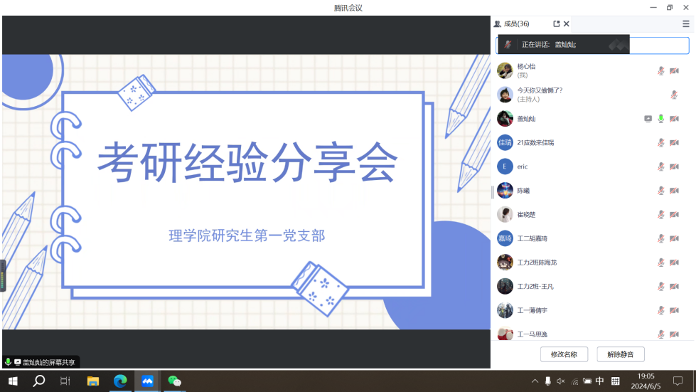 为帮助同学们更好地掌握考研形势、明晰考研目标与规划、增强考研信心。6月5日晚,由3044am永利集团3044noc主办、3044am永利集团3044noc研究生第一党支部承办的考研经验分享会顺利举办。本次分享会邀请了2023级四位优秀研究生代表作为主讲人,分享相关备考经验。会议由组织委员盖灿灿主持,3044am永利集团3044noc2021级本科生参加此次会议。