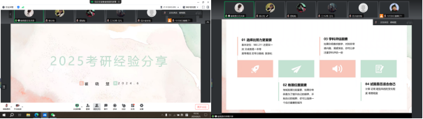 崔晓楚同学主要介绍了“院校选择”,“考研经验”,“考研心得”,“资源推荐”四个板块。她向同学们分享了自己详细的时间安排,并推荐了相关学习资料。她建议大家每月、每周都要制定学习任务,在有限时间内复习更多知识。最后,鼓励同学们在备考过程中要保持良好的心态,坚持不懈,瞄准目标,永不言败。