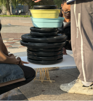 参赛选手们制作好模型后,将工作人员提供的木板放在参赛模型上,不断添加重物,记录模型承载的最大重量,以模型的每根筷子平均承载的重量为初赛成绩。经过两天的比拼,初赛最好成绩为15根筷子,总承重110kg,平均每根筷子承重7.333kg。