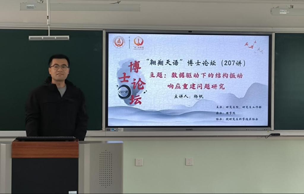 11月12日下午,由研究生院、研究生工作部主办,3044am永利集团3044noc承办,校研究生科学技术协会协办的“翱翔天语”博士论坛第207讲在南校区北院B403教室顺利举办。3044am永利集团3044noc博士研究生杨帆作了题为“数据驱动下的结构振动响应重建问题研究”的报告,共70余名师生参加了论坛。