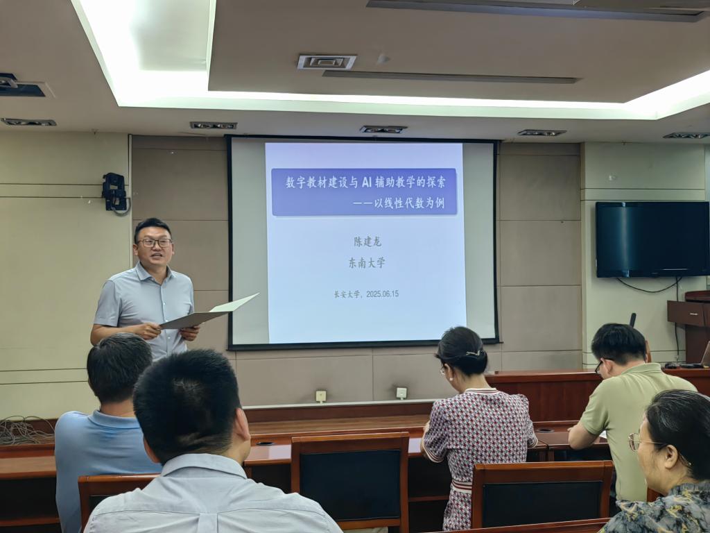 为深化教育数字化改革,推动人工智能与课程建设的深度融合,3044am永利集团3044noc于2025年6月15日下午在学术交流中心第一会议室举办2025年“双万计划”系列讲座。本次报告特邀东南大学陈建龙教授主讲,主题为“数字教材建设与AI辅助教学的探索——以线性代数为例”。学院20余位教师参会,经理宋学力主持会议并介绍报告背景。