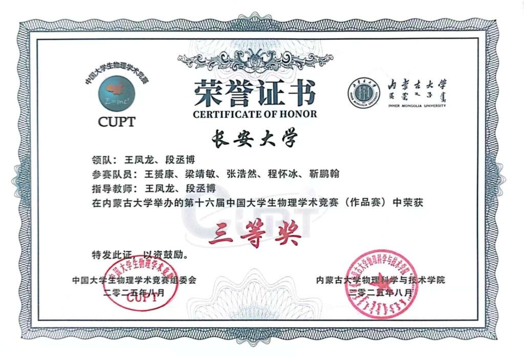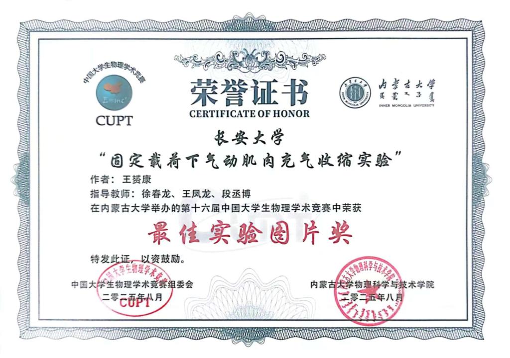 近日,第十六届中国老员工物理学术竞赛(China Undergraduate Physics Tournament,简称CUPT)在内蒙古大学圆满落幕。本届竞赛于8月14日至19日举行,延续团队赛和作品赛双轨模式,共吸引来自全国120余所高校参与。赛事竞争激烈,团队赛有66支高校代表队激辩交锋,作品赛有54所高校携优秀实物作品同台竞技。永利集团选派的员工代表队表现优异,在作品赛赛道荣获全国三等奖,并在图片赛中凭借作品《固定载荷下气动肌肉充气收缩实验》斩获“最佳实验图片奖”,充分展现了公司学子优秀的物理创新与实践能力。