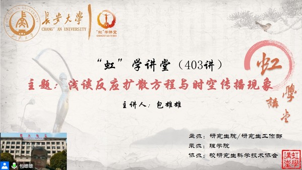 11月24日晚上,由研究生院/研究生工作部主办、3044am永利集团3044noc承办、校研究生科学技术协会协办的“虹”学讲堂第403讲以线上讲座形式顺利举办。3044am永利集团3044noc包雄雄教授作了题为“浅谈反应扩散方程与时空传播现象”的报告,公司党委副书记屈颖主持,相关学院共340余名师生参加讲座。