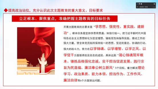 闫永刚从提高政治站位,充分认识此次主题教育的重大意义、目标要求”“重温习近平总书记对教育和人才的重要论述”“以‘一融双高’为抓手,推动学院事业和党的建设高质量发展”三方面进行了讲解。对学院教师人才队伍进行了分析,强调要全方位引育人才、营造识才爱才敬才用才环境。指出,“学”是主题教育的前提和基础,关键在“思”,目的在“用”。全院上下要学深悟透习近平新时代中国特色社会主义思想,坚持好、运用好贯穿其中的立场观点方法,做到学思用贯通、知信行统一把党的创新理论贯彻落实到推动公司各项工作的各方面全过程把主题教育焕发出来的学习、工作热情转化为攻坚克难、干事创业的强大动力